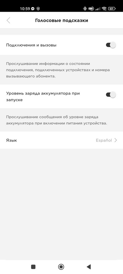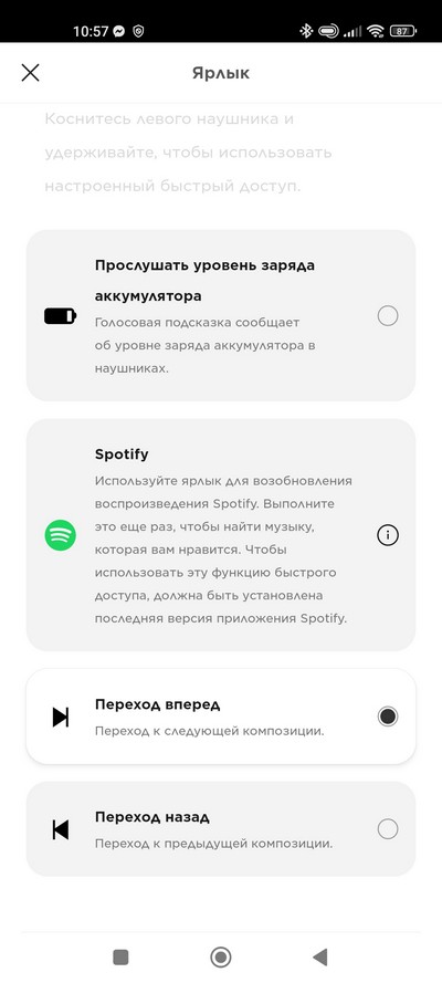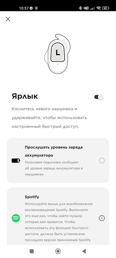 Подключенные наушники в приложении, главная страница. Отмечу, кстати, что перевод на русский - довольно кривой. Например, "Насадки" - это подсказки. А "Ярлык" - это настройки быстрого доступа для левого наушника.