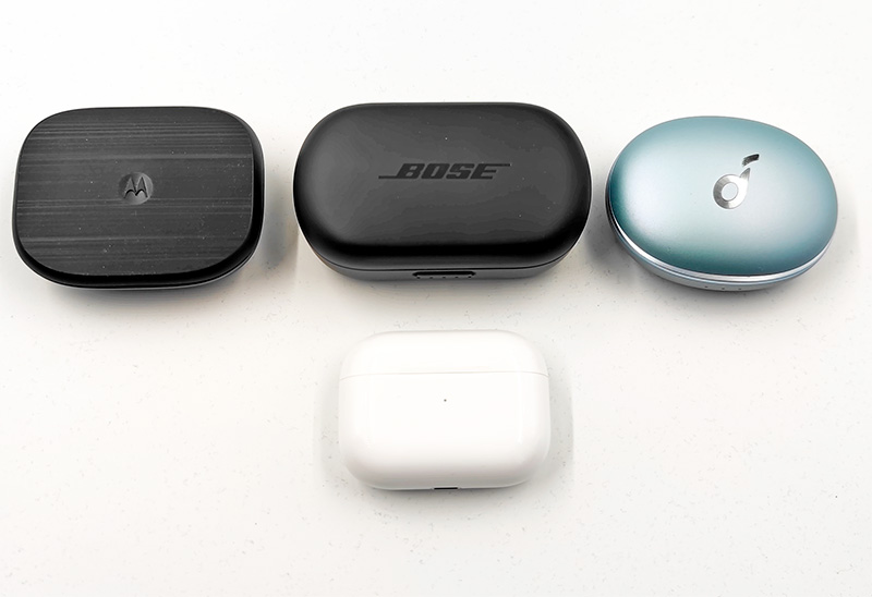 А вот этот кейс рядом с кейсами наушников Motorola Verve Buds 800, Soundcore Liberty 3 Pro и Apple AirPods Pro MagSafe. Как видите, он в полтора раза больше кейсов остальных наушников (но не всех, конечно: у наушников JBL Endurancepeak кейс такой же по размеру и даже немного тяжелее).