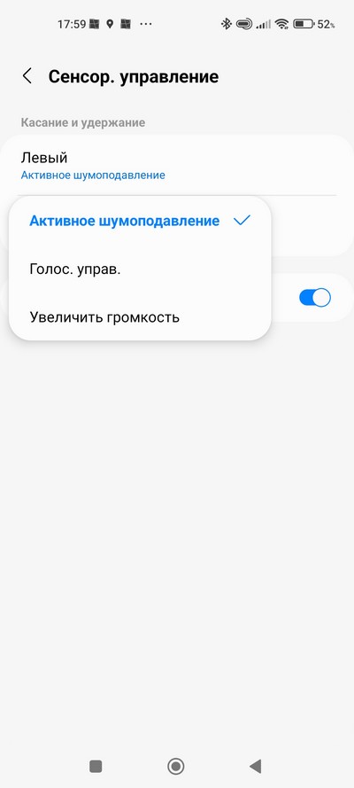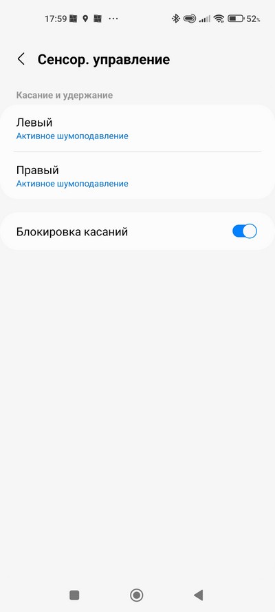 Настройки сенсорного управления. Одиночное касание - играть/пауза, двойное на правом и левом - следующий трек/предыдущий трек, длинное нажатие настраиваемое, и там можно включать шумоподавление, вызывать голосовой ассистент или регулировать громкость (громче на правом, тише на левом). И заметьте, что есть специальная опция блокировки касаний - это очень даже может пригодиться при определенных обстоятельствах. (Кстати, при блокировке будет работать прием и завершение звонков двойным касанием.)