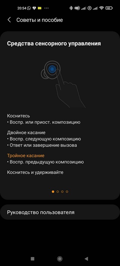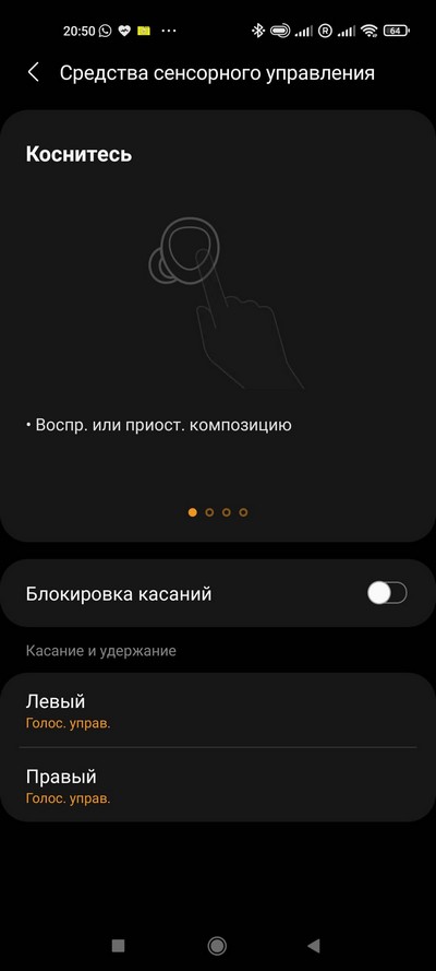 Одно касание - пауза или воспроизведение, два касания - переключение на следующий трек или принятие вызова, три касания - переключение на предыдущий трек. Длинным касанием можно включать голосовой ассистент на смартфоне, также можно через приложение настроить так, что длинным касанием можно менять уровень звука (некоторым пользователям это важно) или изменять режим звукового фона.