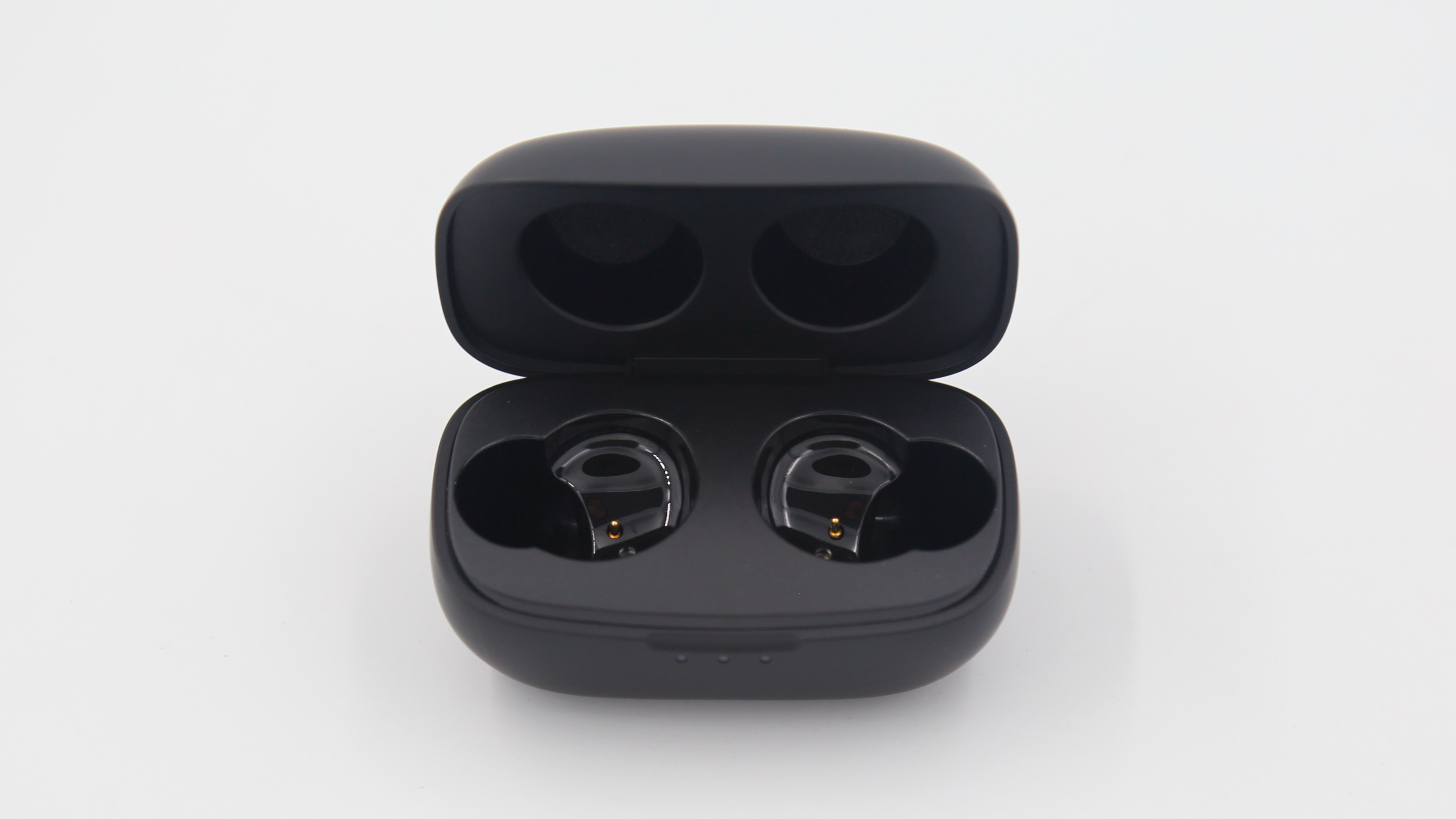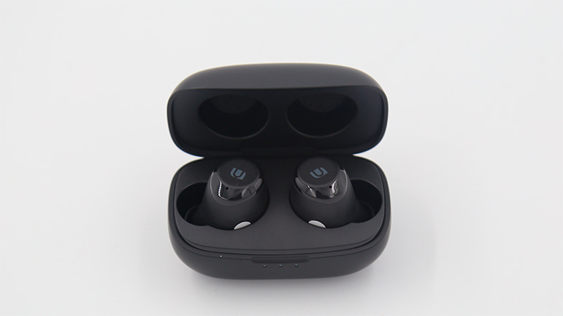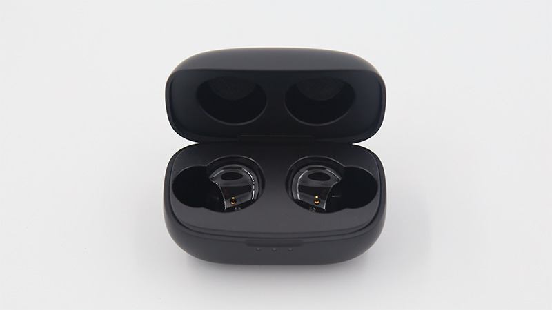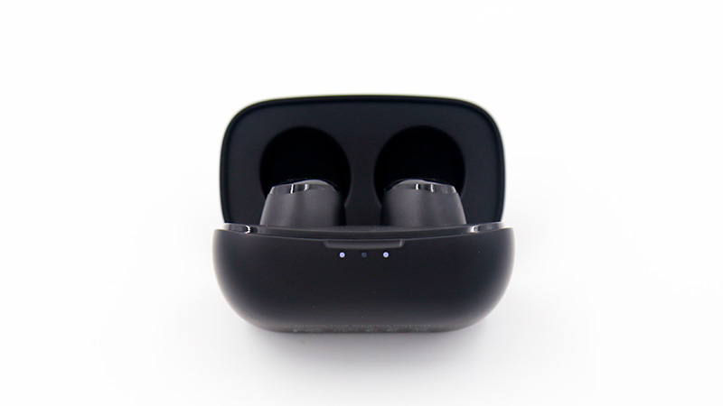 Зарядный кейс выполнен из матового черного пластика. На передней грани располагается углубление, помогающее подцепить и открыть крышку, под ней - три светодиода.