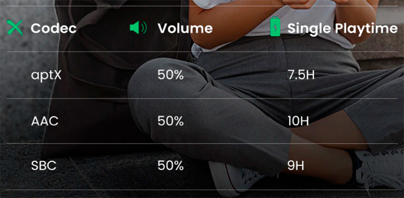 Я протестировал aptX на полной громкости на улице. Получилось где-то 6,5 часа - ну, очень даже прилично, у тех же Xiaomi AirDots Pro 2 - порядка 4 часов.