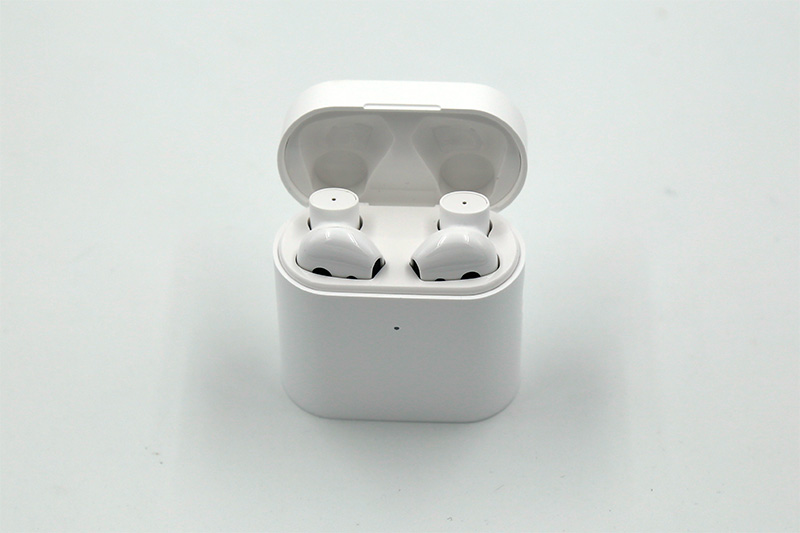 Наушники в кейсе примагничиваются к контактам, на которые подается питание. Зарядный кейс закрывается крышкой на магните. У кейса справа есть кнопка сопряжения, на передней части кейса расположен светодиод, демонстрирующий состояние кейса и наушников (заряжаются, заряжены, подключены, подключены в режиме сопряжения).