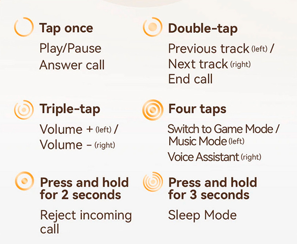 Управление здесь сенсорное. По умолчанию схема управления следующая (но ее можно менять через приложение). Одно касание - играть/пауза (ответ на звонок), двойное касание - предыдущий (левый наушник) или следующий трек (правый наушник), также окончание звонка в случае разговора. Тройное касание - регулировка громкости, четверное касание - переключение между режимами (игровой режим, прослушивание музыки, голосовой ассистент), двухсекундное нажатие - сброс звонка, трехсекундное нажатие - переход в режим сна.