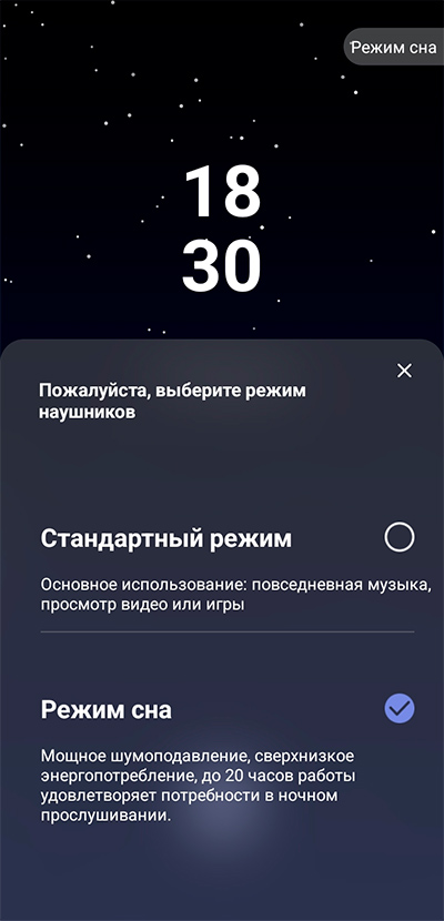 При переходе в этот режим там предлагается переключить наушники в специальный "Режим сна". Насчет "мощного шупомодавления" это они, конечно, загнули: у этих наушников нет никакого активного шумоподавления, только пассивное - за счет того, что они затыкают ушной канал.