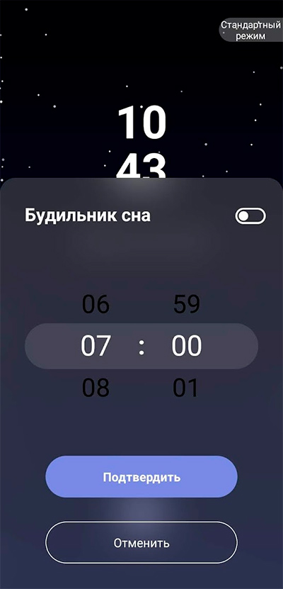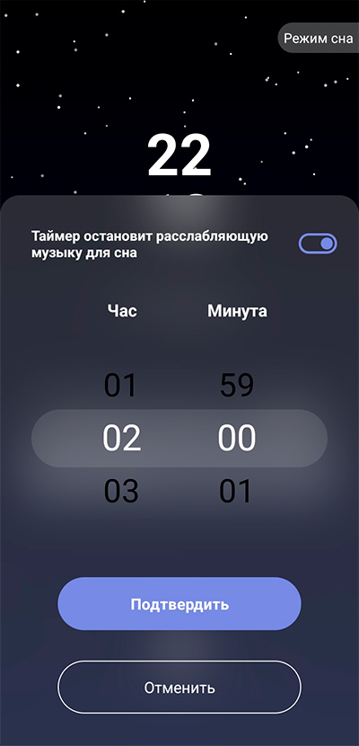 Здесь можно выставить будильник и таймер. Будильник в указанное время начнет очень тихо проигрывать приятную музыку, постепенно увеличивая громкость, а таймер отключит воспроизведение через указанный временной диапазон.