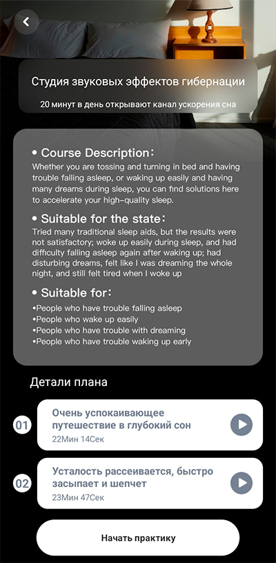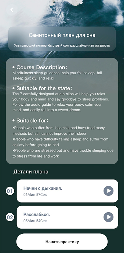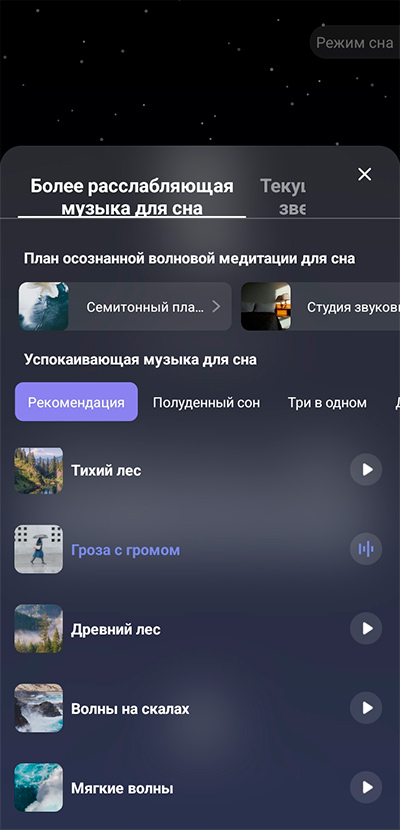 В режиме сна можно выбирать как конкретные расслабляющие треки, так и всякие планы, направленные на ускорение засыпания и улучшение качества сна.