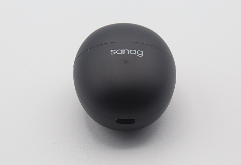 Порт Type-C для зарядки находится у зарядного кейса внизу. Под надписью "Sanag" располагается светодиод, который показывает процесс зарядки.