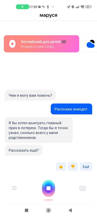 Если подключить колонку к смартфону, то через нее можно воспроизводить аудио со смартфона, также в смартфоне можно использовать любой голосовой помощник - ту же "Марусю" или "Алису", - с выводом звука через колонку: вот, например, я тестировал "Марусю".