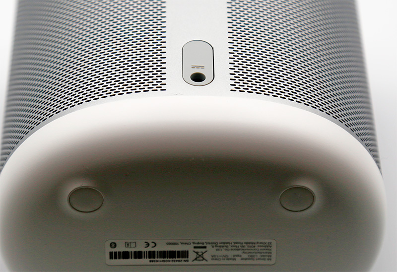 На нижней грани колонки расположены четыре силиконовых ножки. На задней грани снизу - вход для адаптера питания. Колонка для работы требует питания 12В/ 1,5A, так что здесь используется специальный адаптер, длина кабеля которого - 120 см. Больше никаких других выходов - например, аудио - у колонки нет.