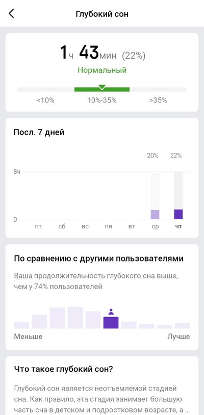 Ну это да, индивидуально. Возможно, с другим ремешком было бы комфортнее. Но это лишь одна из проблем. У бипов гораздо подробнее аналитика данных в приложении. Редми выдает лишь цифры, по которым не понятно, хороший ли был сон, насколько нормальное мое состояние. Но больше всего меня разочаровал трекинг GPS, который вырубился во время велопрогулки и восстановился только через несколько километров.