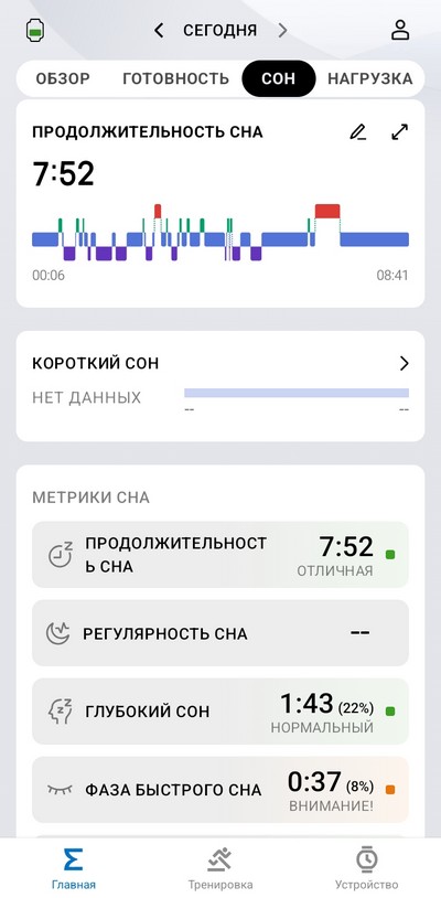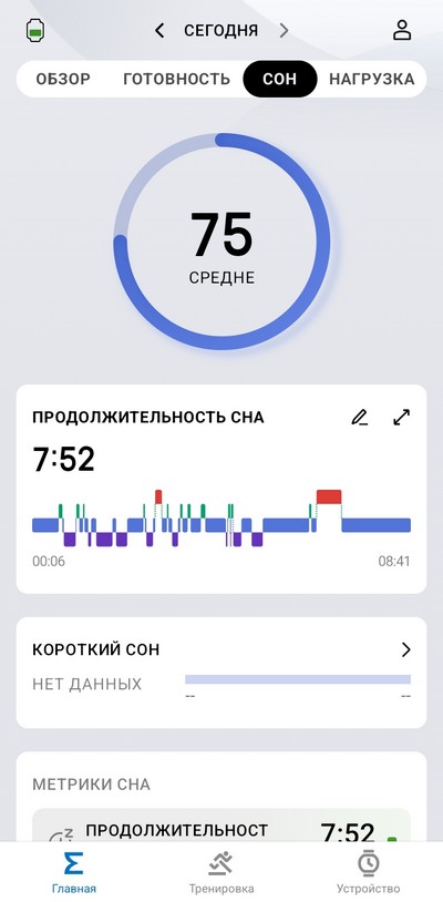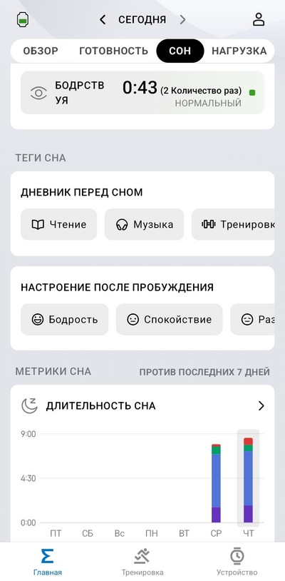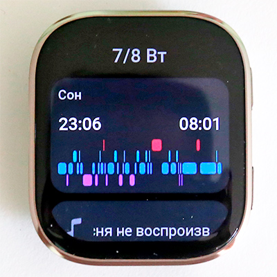 Мониторинг сна - очень хорошо, сон измерялся достаточно точно. Часы и нормально отслеживают просыпание и продолжение сна, отдельно определяют и выводят дневной сон. По качеству отслеживания сна они находятся на уровне часов Huawei, которые в этом плане, на мой взгляд, лучшие. А вот мои Samsung Galaxy Watch7 с отслеживанием сна довольно часто лажают.