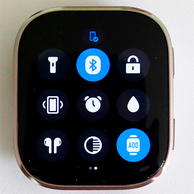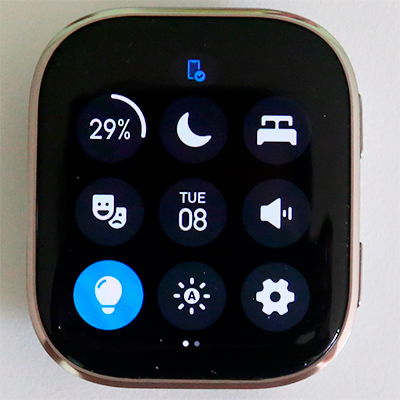 Свайп от циферблата вниз - области быстрых переключателей и информеры. Настройки экрана, беспроводной связи, беззвучный режим, блокировка, поиск телефона, фонарик, режим "в театре" и так далее.
