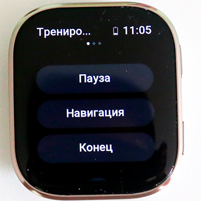 Вернуться к другим приложениям во время тренировки вы можете длинным нажатием нижней кнопки. На тренировке по свайпу влево открывается аудиоплеер. По свайпу вправо - пауза, навигация (может показать маршрут и где вы находитесь) и завершение тренировки.