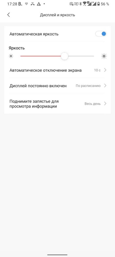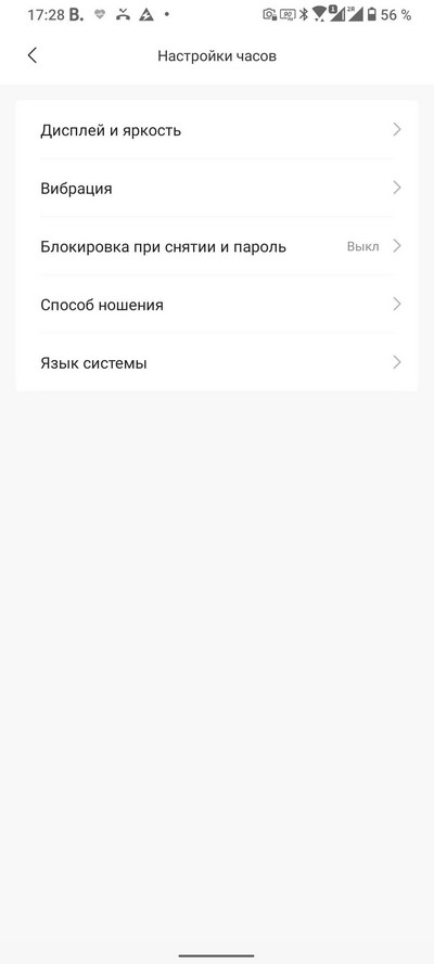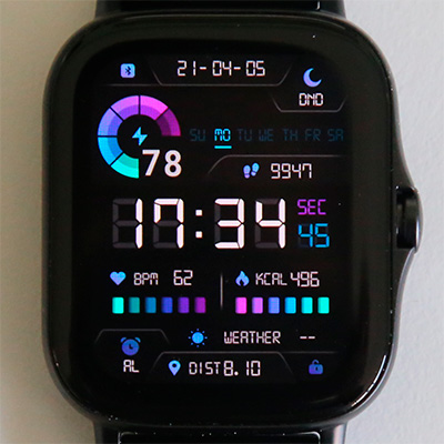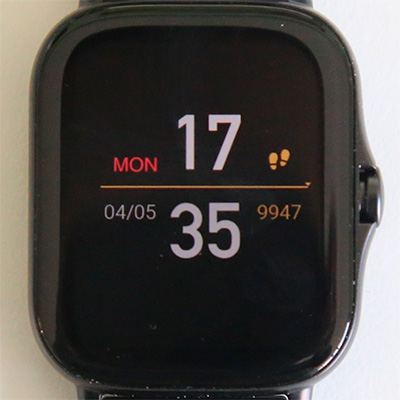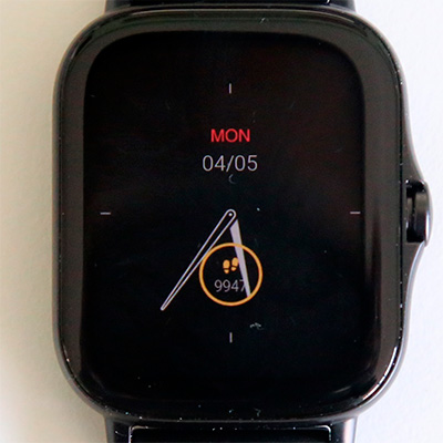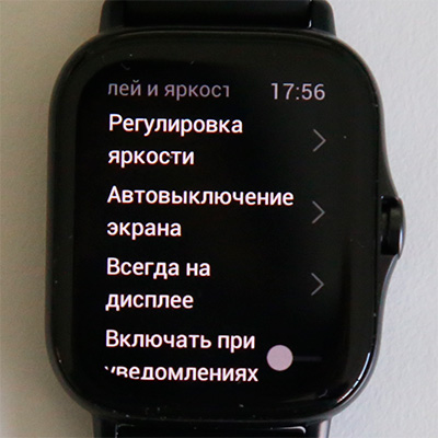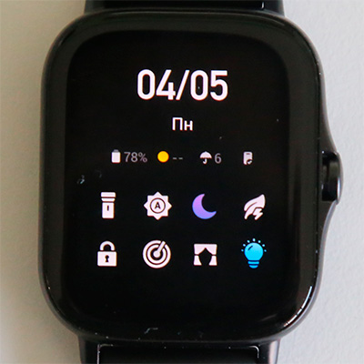 Свайп циферблата вниз - информационные данные (дата, день недели, заряд аккумулятора, погода, сопряжение со смартфоном) и пиктограммы переключателей: фонарик, настройка дисплея, режим "Не беспокоить", энергосберегающий режим (при этом на экране будут только уровень заряда, дата, время и количество шагов, также часы будут отслеживать сон; постоянно включенного экрана не будет, активизироваться часы будут только по кнопке), блокировка экрана от нажатий (для плавания), поиск телефона (он будет звонить), режим "Театр" (яркость экрана гаснет, и отключаются режим постоянно включенного экрана и включение циферблата подъемом запястья) и постоянное включение дисплея в полном режиме (это работает только ограниченное время - 20 минут).