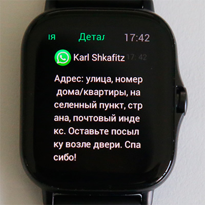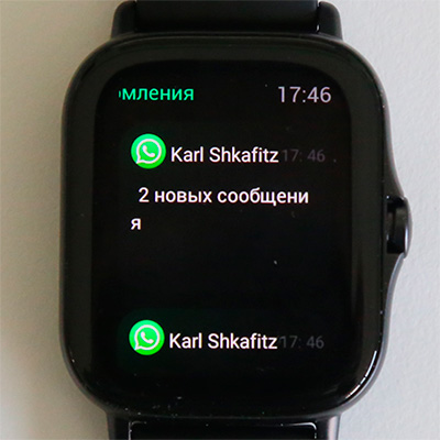 Возвращаемся к циферблату. Свайп вверх - пришедшие уведомления. Каждое уведомление можно развернуть и прочитать целиком. Отвечать на уведомления с часов нельзя.