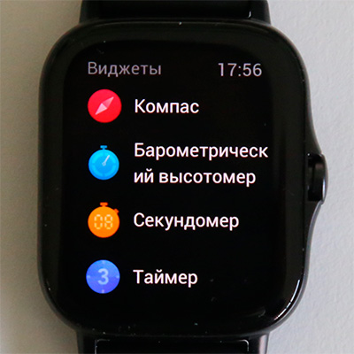 Как обычно у Amazfit (и это очень странно), в разделе "Виджеты" скрывается еще несколько приложений: компас, барометрический высотомер, секундомер, таймер и поиск смартфона.