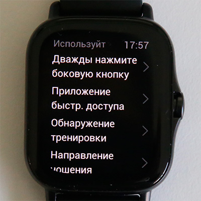На двойное нажатие боковой кнопки можно навесить вызов любого приложения, также здесь можно настроить виджеты, появляющиеся при свайпе циферблата влево-вправо.