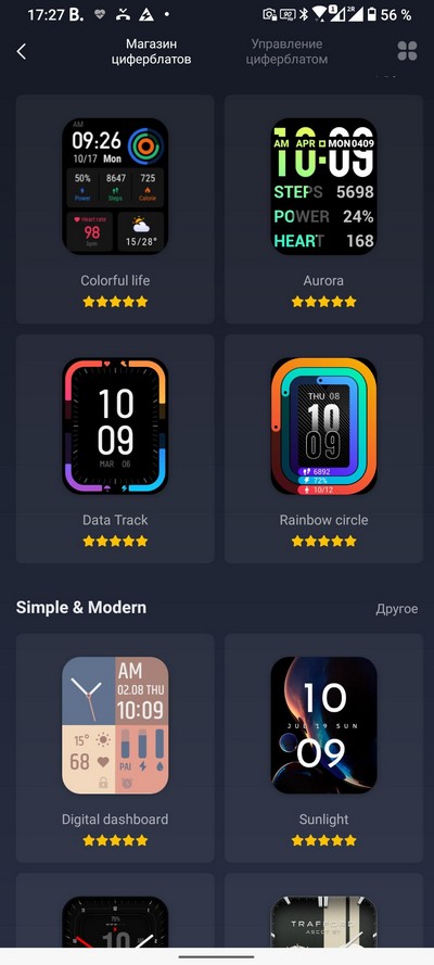 Главный десктоп (циферблат) и режим постоянно включенного экрана. В отличие от GTR 2, где скин постоянно включенного экрана зависит от скина циферблата, здесь только три варианта: классический, цифровой и диски циферблата - вот все три. Но, впрочем, как раз классический зависит от вида циферблата.