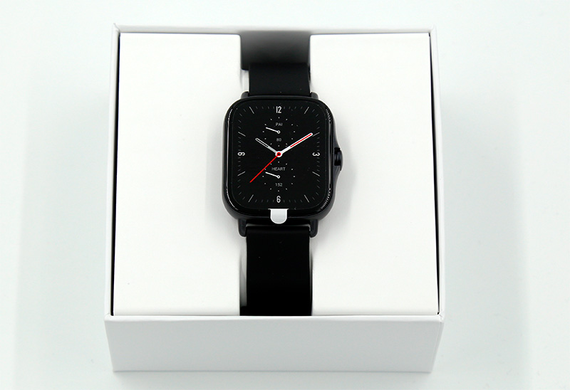 Такой же стиль оформления, как и у GTR 2: белая коробка с суперобложкой, на которой нанесены изображение часов и название модели, выполненное знаками с меняющейся окраской. Смотрится довольно свежо.