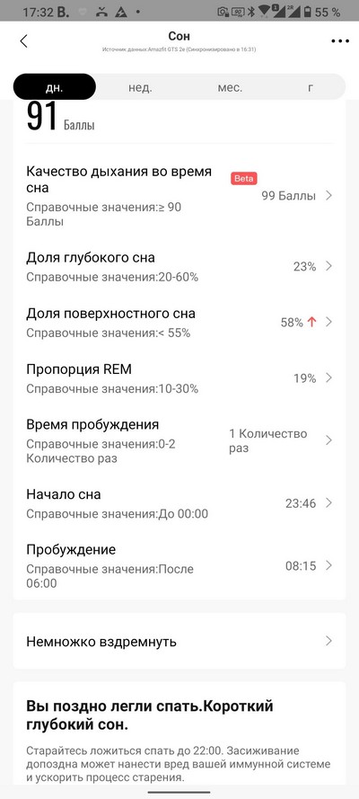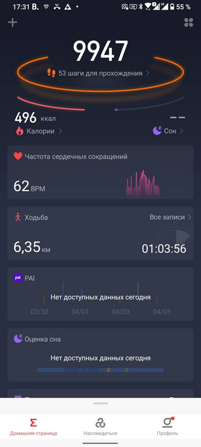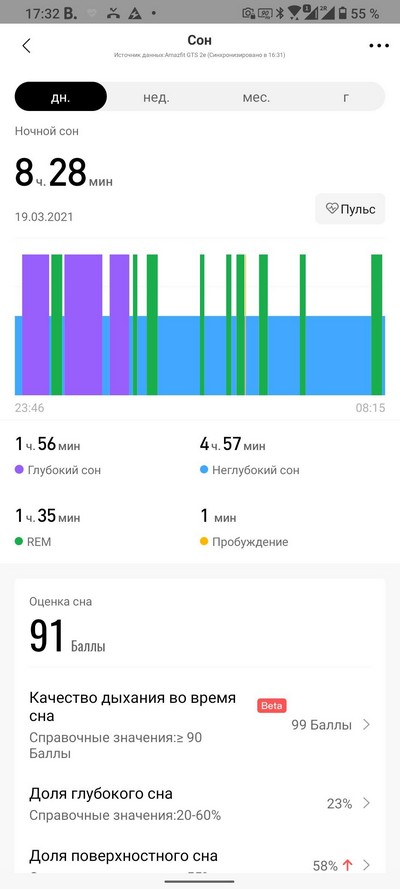 Отслеживание сна - терпимо. Пробуждение фиксируют вроде неплохо, общий замер более или менее коррелирует. Дневной сон не фиксируют (его мало какие часы вообще замечают, кроме Huawei, которые сон отслеживают лучше всех), а вот насколько точно замеряют глубокий и неглубокий сон - тут я ничего сказать не могу. Да, ну и по поводу отслеживания сна - здесь, как и у остальных Amazfit, в часах вообще нет приложения "Сон" и соответствующего виджета. То есть вы параметры сна можете посмотреть только в смартфоне, что реально раздражает, потому что мне нередко нужно проверять, сколько я проспал, как только я проснулся. В часах Huawei и Samsung это прекрасно делается, в Amazfit - черта с два! Что мешало сделать такое приложение с виджетом - непонятно совершенно.