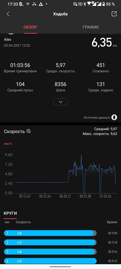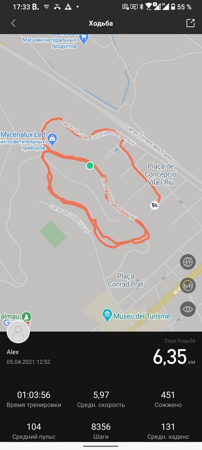 Тренировки - прилично. У GTR 2 с тренировками поначалу были определенные проблемы, но после пары обновлений вроде все устаканилось. Здесь на первом измерении прогулки часы почему-то заметно завысили километраж (в упор не понимаю, как они ухитряются неправильно мерить километраж с включенным GPS), но со следующей прогулки уже измеряли точно, да и с пульсом никаких фокусов не выкидывали - показывали вполне ожидаемые значения.