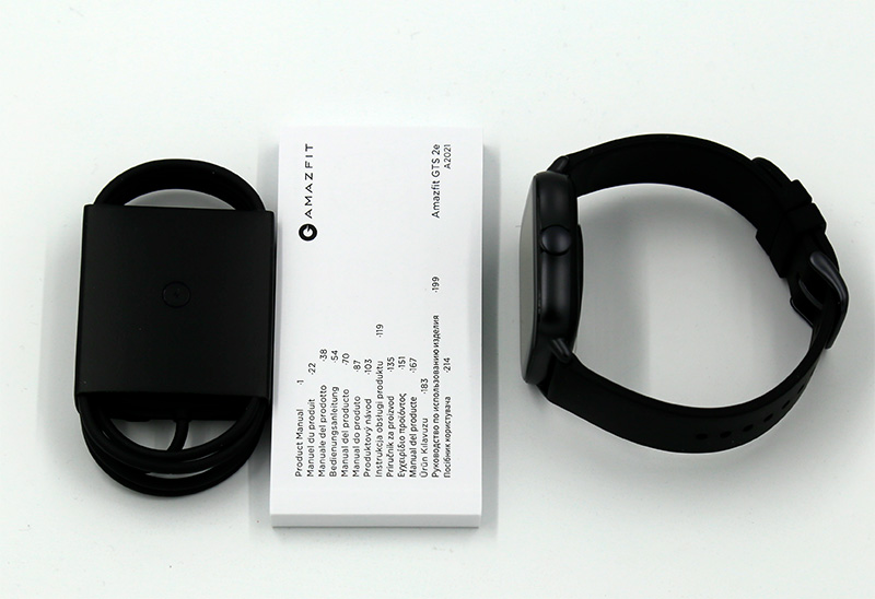 Комплект поставки: часы с ремешком, инструкция на разных языках, контактный крэдл для зарядки.