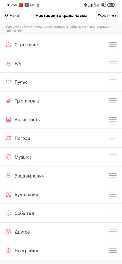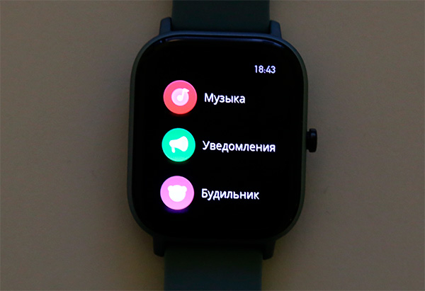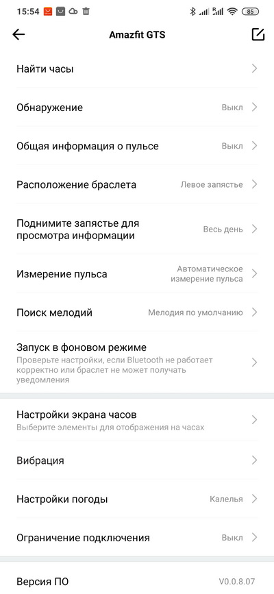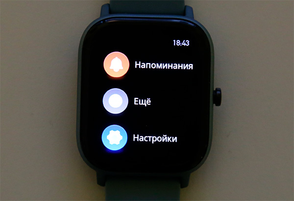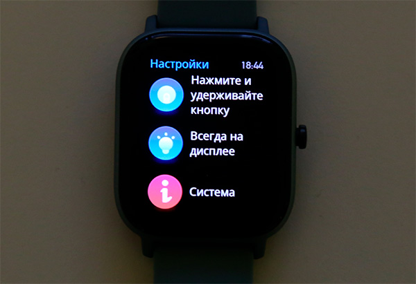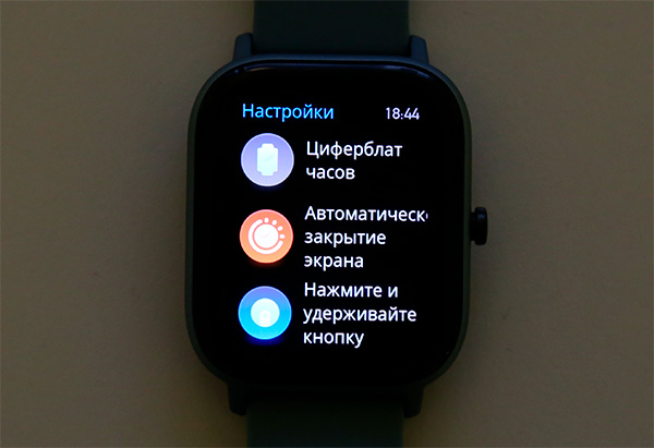 Настройки. Выбор циферблата, продолжительность свечения циферблата (от 5 до 15 секунд), вызов приложения при длинном нажатии кнопки (например, "Спорт").
