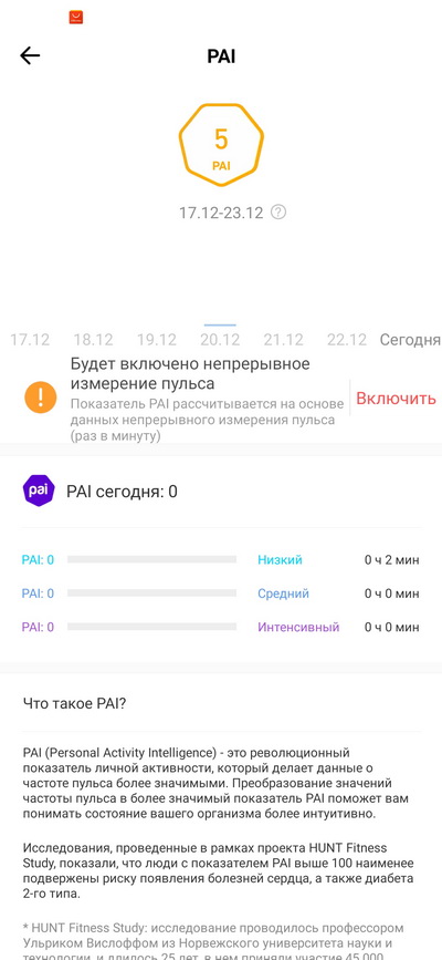 PAI - это показатель личной активности, который требует непрерывного измерения пульса.