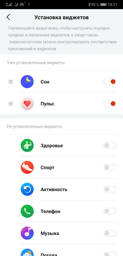 Установка виджетов. Первые два виджета присутствуют в окнах, появляющихся по свайпу с циферблата часов, остальные - в виде пиктограмм приложений.