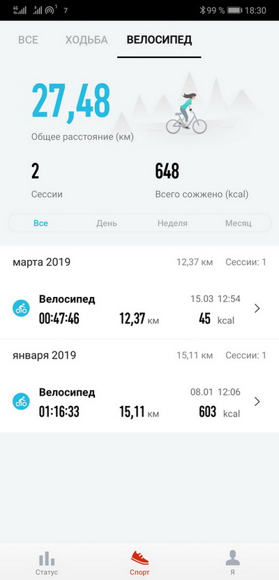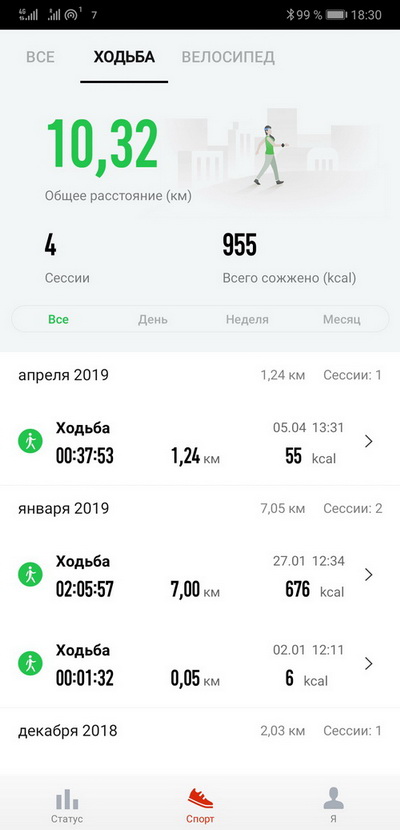 Здесь поддерживаются одиннадцать видов активностей: бег, бег на беговой дорожке, бег по пересеченной местности, ходьба, занятия на эллипсоиде, ходьба по горам, теннис, лыжи, футбол, велосипед, велотренажер. Плавание, подчеркиваю, не поддерживается.