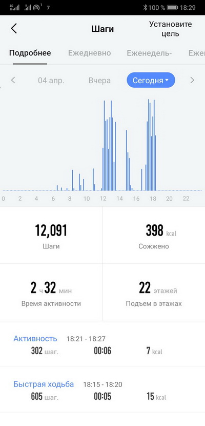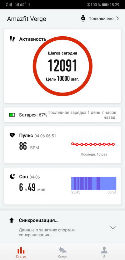 Главная страница активности. Шаги, батарея, пульс, сон, другие закладки.