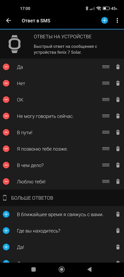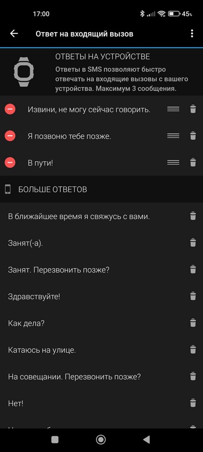 На входящие вызовы и SMS можно отвечать предустановленными сообщениями, которые редактируются. Замечу, что доступно это только при использовании часов на Android, для айфонов такая возможность отсутствует (из-за ограничений операционной системы).