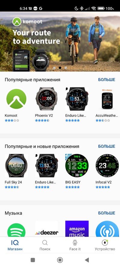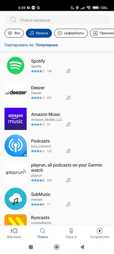 В разделе "Музыка" можно выбирать источник музыки (потоковый сервис, память часов, куда музыка загружается через Garmin Express на ПК), также можно подключать Bluetooth-наушники и управлять воспроизведением на смартфоне.