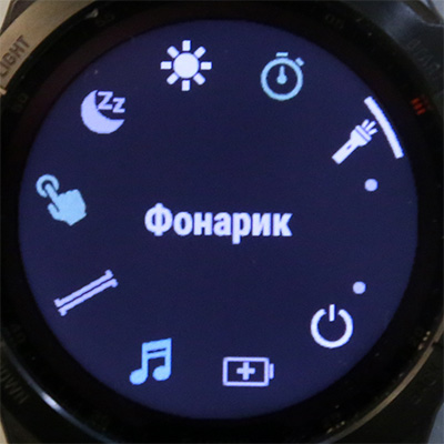 Длинное нажатие на кнопку подсветки - меню элементов управления. Его тоже можно как угодно редактировать. По умолчанию там установлены: выключить питание, управление музыкой, найти телефон, сохранить местоположение, заблокировать кнопки, включить режим "не беспокоить", синхронизировать с телефоном, подключить-отключить телефон, включить режим энергосбережения.