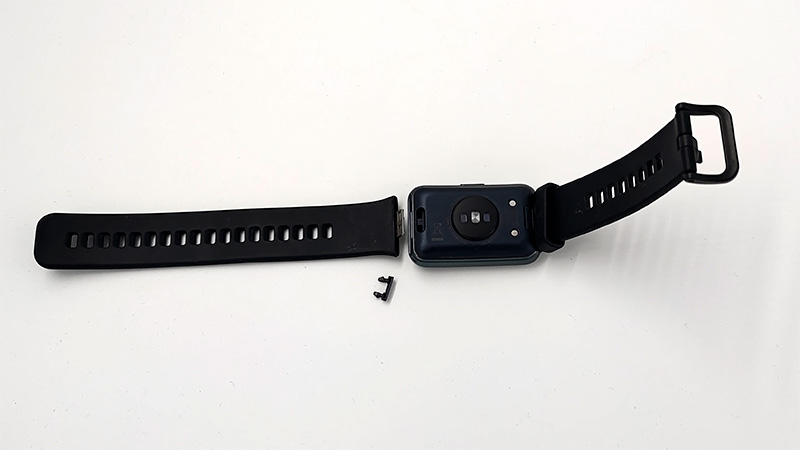 Также на нижней крышке видны блокираторы двух частей ремешка: чтобы снять ремешок, блокиратор нужно поддеть тонкой плоской отверткой и вытащить. (В некоторых обзорах почему-то пишут, что ремешок здесь - несъемный. Это не так.) Впрочем, отдельных ремешков для этих часов я пока не обнаружил, но они явно скоро появятся.