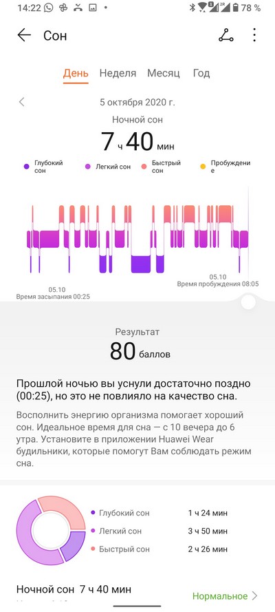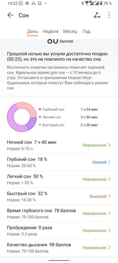 Отслеживание сна - максимально подробное и максимально точное. По моему опыту, точнее устройств Huawei сон не отслеживает никто, они реально лучшие. Даже дорогущие Samsung Galaxy Watch 3 им в этом заметно уступают.