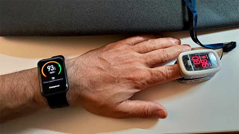 Сразу скажу по поводу оксигенации, благо тема нынче очень важная. Сначала я пытался сравнивать измерения часов одновременно с пульсоксиметром, и там была очень большая разница - вот примерно такая. И это показывало, что доверять подобным данным нельзя: 93 - это уже сильно настораживающий показатель.