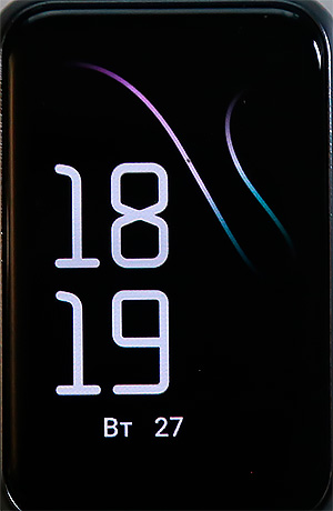 Здесь есть режим постоянно включенного экрана - примерно так это выглядит, причем вариантов заставки - шесть штук: два стрелочных и четыре цифровых. Из режима заставки часы выводятся или двойным тапом по экрану, или кнопкой.