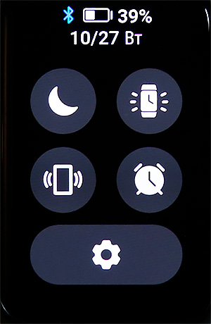 При свайпе вниз - область быстрых переключателей и настроек. Пиктограммы ночного режима, поиска смартфона, включение экрана на определенное количество минут (задается в настройках) и будильника.