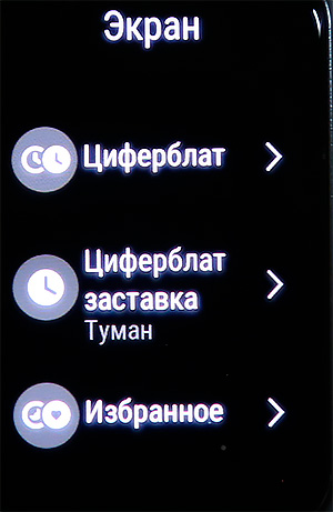 В настройках экрана выбирается циферблат, заставка постоянно включенного экрана, избранные приложения (это те, которые закольцованы по свайпу влево-вправо от циферблата), яркость, когда выключать экран, сколько держать экран включенным.
