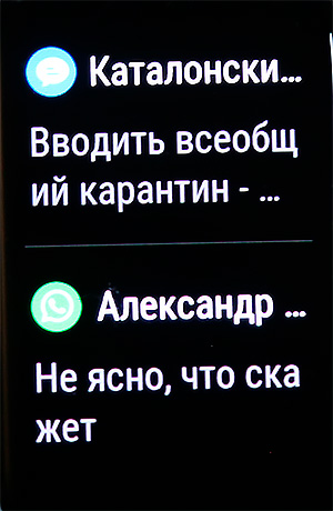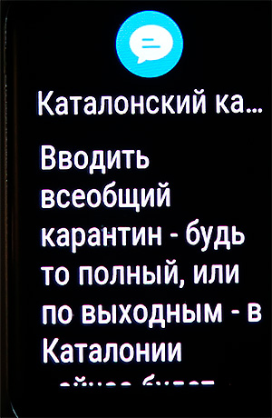 От циферблата свайп вниз - все уведомления, при нажатии на конкретное - просмотр. Читать текст уведомлений на таком экране очень удобно. Замечу, что отвечать на уведомления, даже с помощью каких-то стандартных фраз, здесь нельзя.