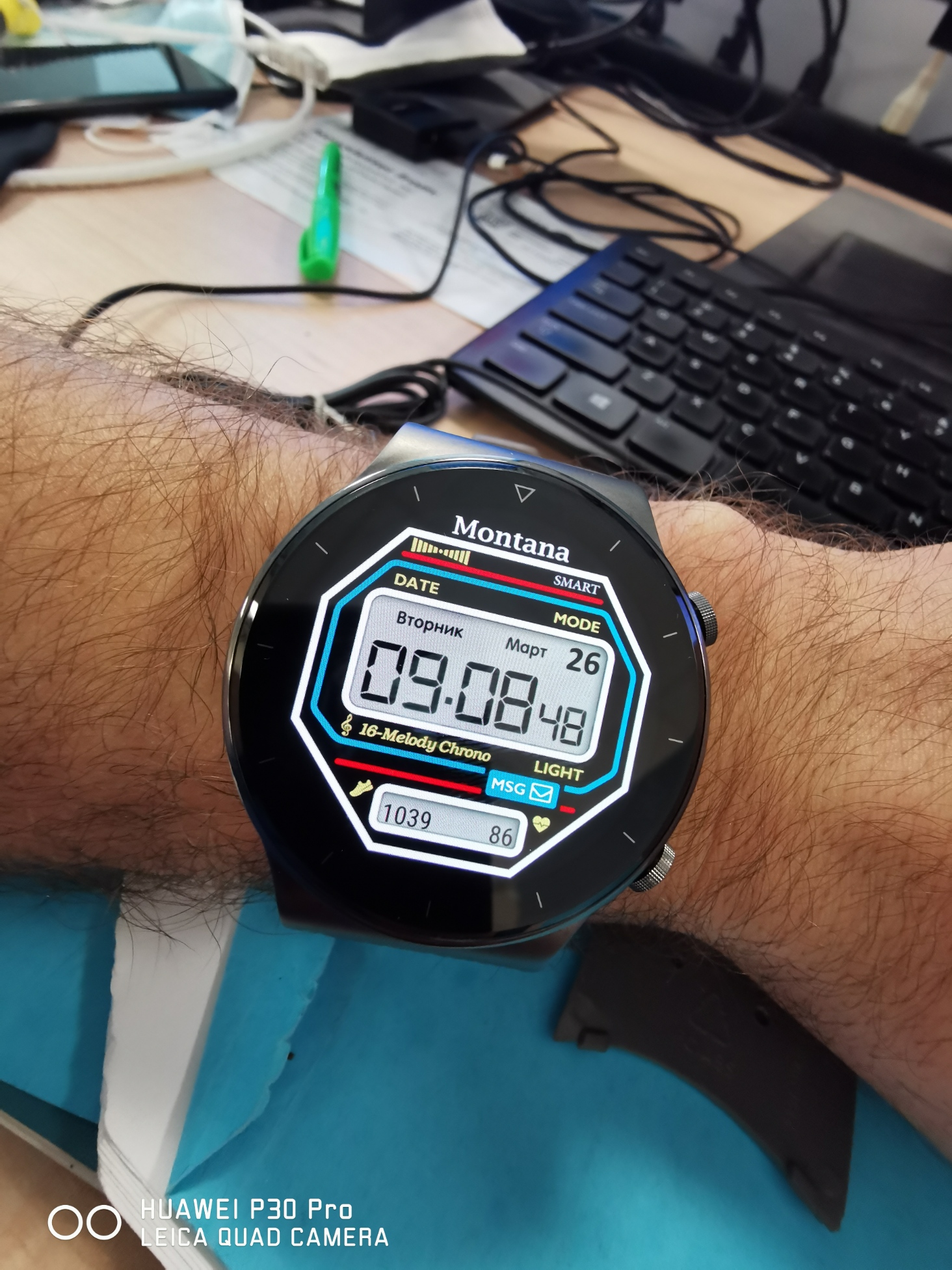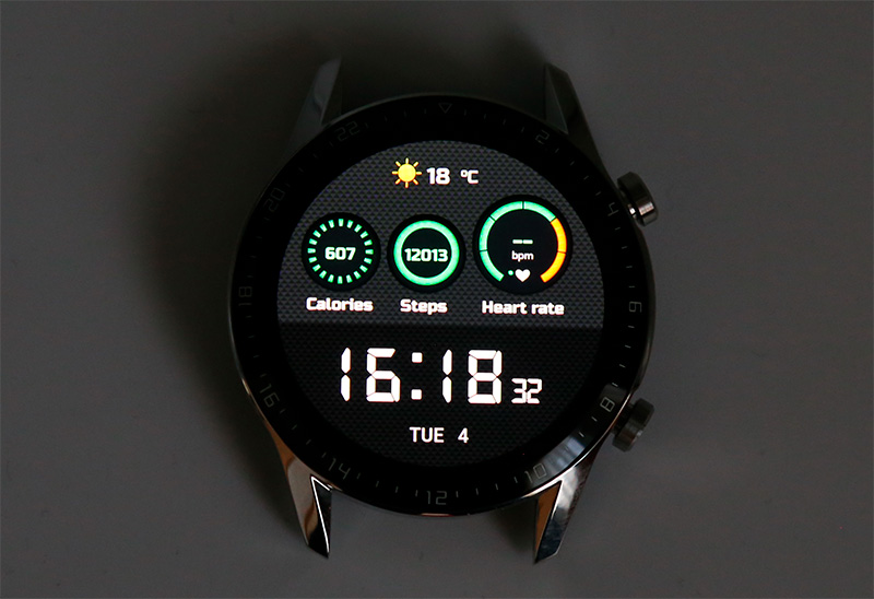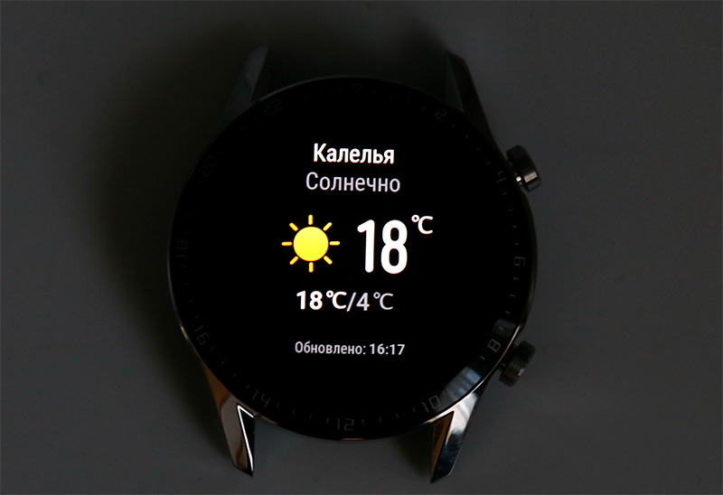 Вот изображение на часах под прямыми солнечными лучами. Раньше о таком и мечтать не приходилось - у тех же первых Huawei Watch информация на солнце становилась совершенно неразличимой.