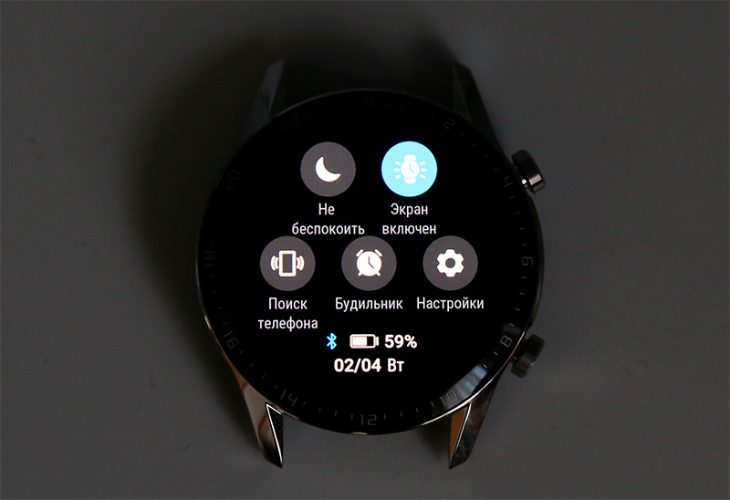 Свайп основного циферблата вниз - область быстрых переключателей и информации. Тут показываются уровень заряда батареи, статус подключения к телефону, дата и день недели. Также тут пять пиктограмм: "не беспокоить", режим постоянно включенного экрана, поиск смартфона, будильник и настройки.