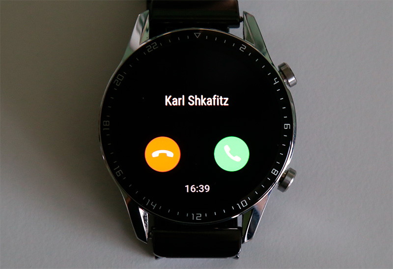 Входящий звонок. Если его принять здесь, то разговор будет вестись через микрофон и динамик часов - в некоторых случаях это удобно (например, в машине, когда смартфон не подключен к громкой связи). Качество звука - хорошее, я несколько раз проверил: и голос в динамике звучит достаточно громко, и мой голос абоненты слышали хорошо.