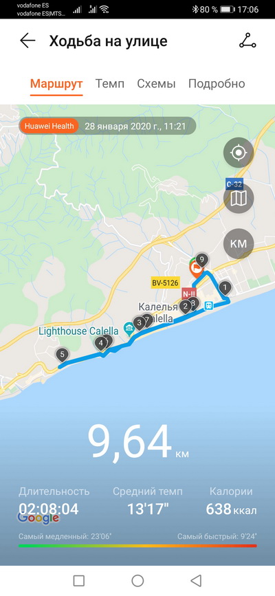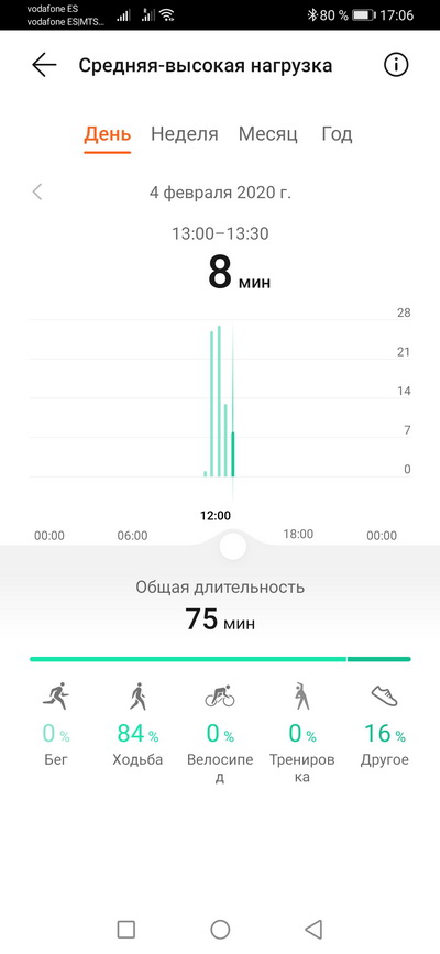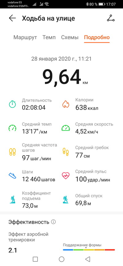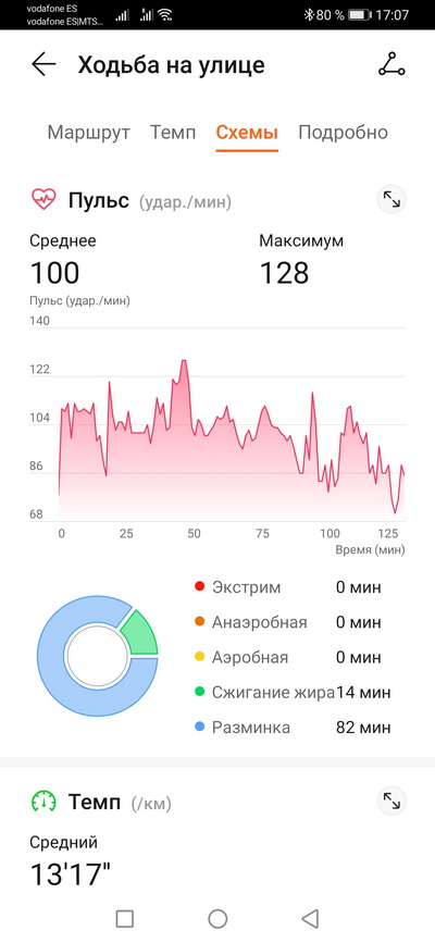 Ходьба на улице. Пульс, темп, расстояние, время, текущее время. Плюс еще четыре экрана: шаги, частота шагов и калории; общий подъем и текущий подъем; текущий пульс; эффект тренировки. Тренировку можно ставить на паузу, блокировать и разблокировать экран (для плавания это актуально), останавливать. На окружности размечены зоны пульса и в процессе тренировки высвечивается определенная зона.