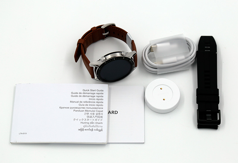 Комплект поставки: часы с кожаным ремешком, дополнительный силиконовый ремешок черного цвета с классическим фиксатором, крэдл для зарядки, кабель USB - Type-C для крэдла, руководство пользователя, гарантийный талон.