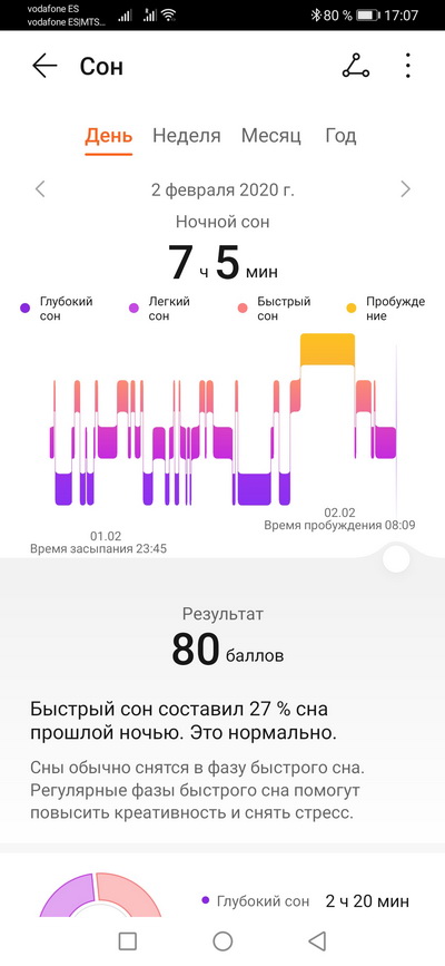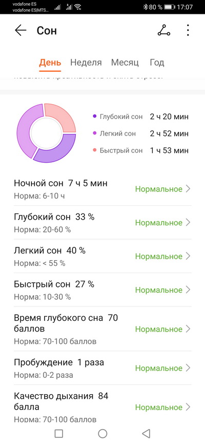 Мониторинг сна с подробными данными по фазам сна и анализом. Заметьте, эти часы даже временное пробуждение нормально фиксируют и отслеживают - у меня мало какие из других умных часов были на это способны. Вообще, по моим наблюдениям у часов Huawei - лучшее отслеживание сна из всех устройств, что у меня были. Очень точно все фиксируют, ошибок почти нет.