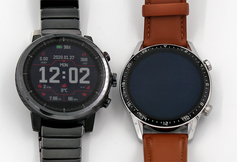 Вот эти часы в сравнении с Amazfit Stratos. Huawei GT 2 выглядят заметно эффектнее, как мне кажется.