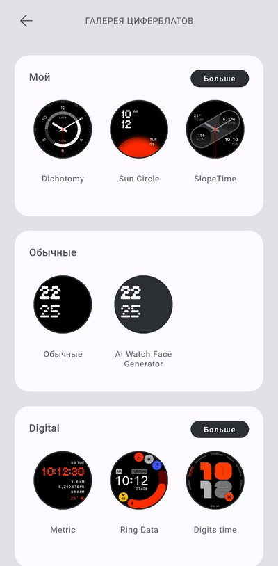 Циферблаты меняются при длинном нажатии на дисплей, в настройках часов и настройках часов в смартфоне.